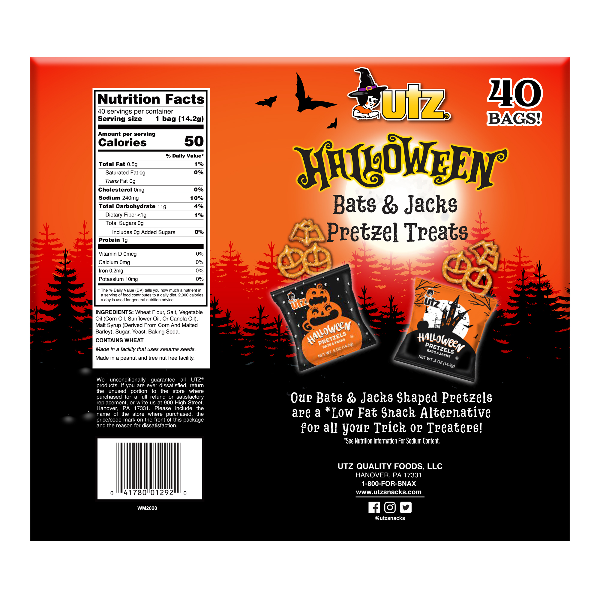 This bag contained two shapes of pretzels with half shaped like bats the flying kind not the baseball kind and the others supposedly shaped like Jack-O-Lanterns. Best Utz Halloween Pretzels Nutrition Information from Utz Halloween Mini Cheese Balls 25 CountSource Image. Serve some Utz pretzel treats to guests at your next party or special occasion.