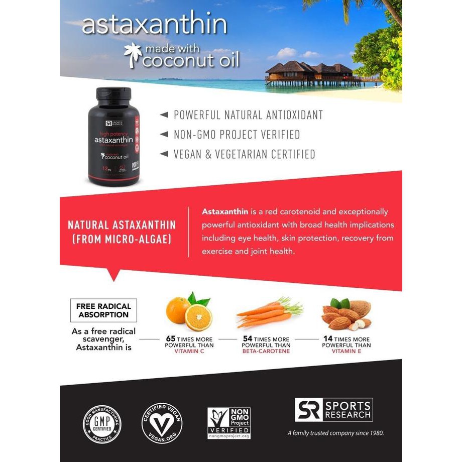 SR Astaxanthin is a vibrantly colored carotenoid derived from microalgae. 12 mg --Package Quantity. A Supplement for Your Skin Eyes and Body Muscles.